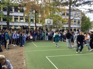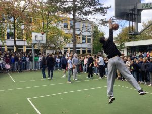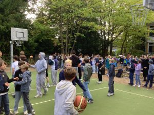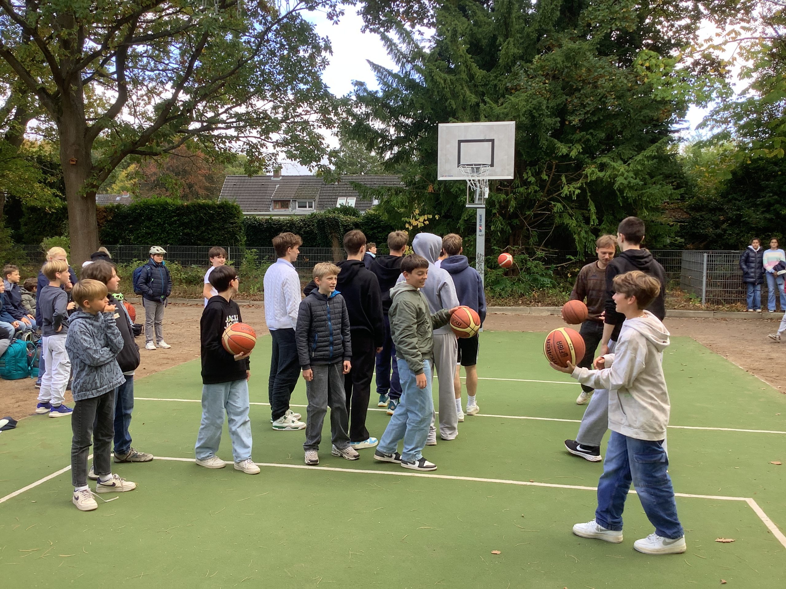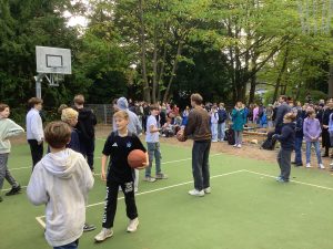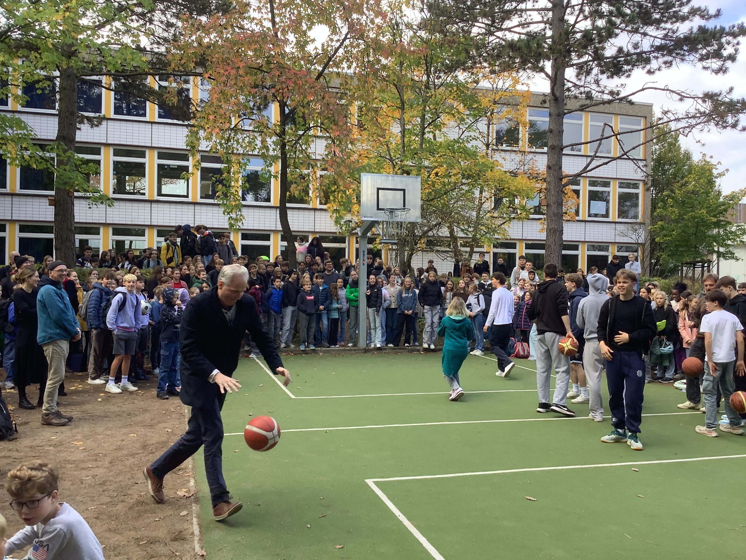 Nachdem wir im vergangenen Schuljahr unseren viel bespielten Bolzplatz durch Bauarbeiten verloren hatten, konnten wir diesen Bereich des Pausenhofes am 17. Oktober der Schulgemeinschaft wieder übergeben. Durch die grundlegende Umgestaltung gelang es den Bereich zu entsiegeln, Platz für ein grünes Klassenzimmer zu schaffen und den lang gehegten Wunsch unserer Schülerschaft nach einem Basketballfeld zu realisieren. Nach ein kurzen Rede von Frau Herzog versenkten die Spieler unserer Basketball-AG die ersten Bälle sicher in den Körben.