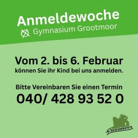 In der ersten Februarwoche können Sie ihr Kind hier – am Gymnasium Grootmoor – anmelden. Bitte vereinbaren Sie zuvor im Schulbüro einen Termin. Vielen Dank!