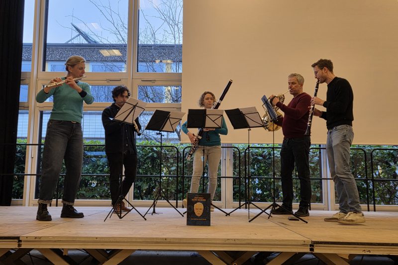 Am Montag waren der Schauspieler Roman Knižka, die Dramaturgin Kathrin Liebhäuser und das Bläserquintett OPUS 45 im Rahmen eines Projekttags zu ihrem Konzertprogramm „Ich wand’re durch Theresienstadt …“ an unserer Schule: Zwei 10. Klassen hatten so die Gelegenheit, Geschichte unmittelbar zu erleben und selbst Teil des Programms zu werden.